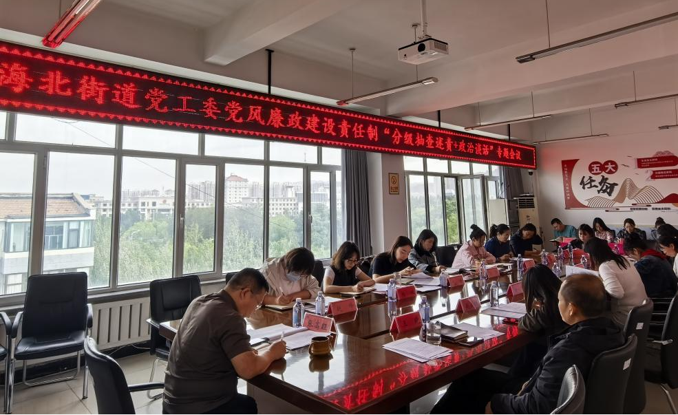会议听取了部分班子成员、社区党委书记和科室负责人落实党风廉政建设责任制情况汇报,海北街道党工委书记张高旺根据履责情况,对抽查对象逐一点评,并开展集体政治谈话。